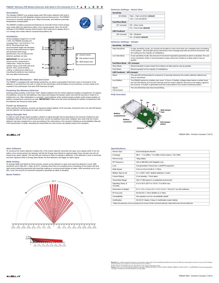 Wireless pir motion detector with built in pet immunity v1 0 detector settings quick view description sensitivity the paradox pmd2p is an analog single optic pir motion detector with built in pet immunity for use with magellan wireless receivers transceivers.